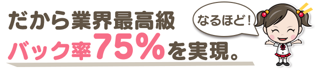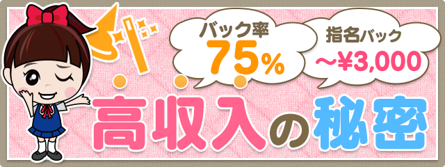 基本バックは75%と業界最高クラス。さらに指名バック3,000円で、女の子の頑張りをしっかりお給料に反映します。。